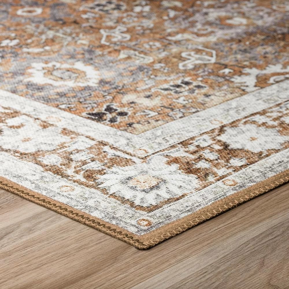 This brown area rug has a zig zag stitch surge and is non-skid